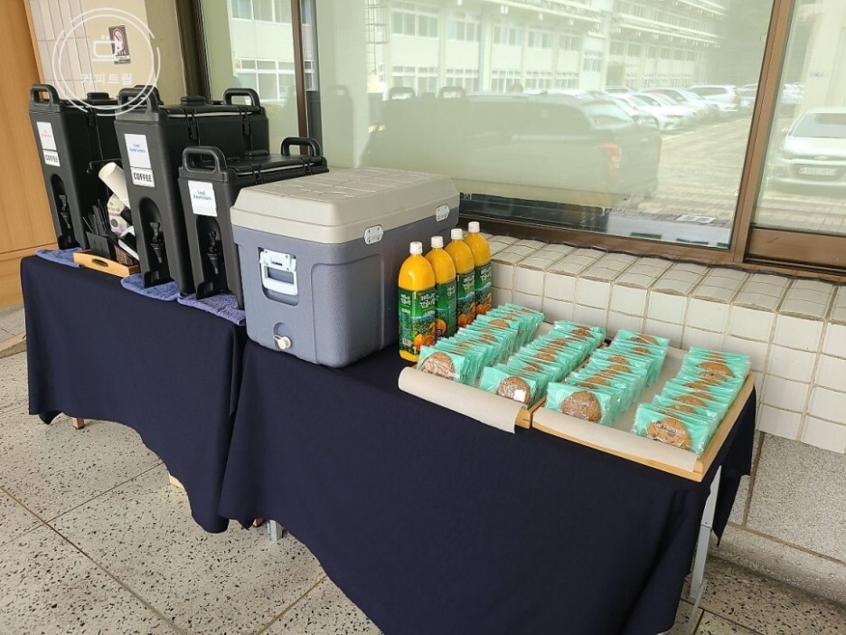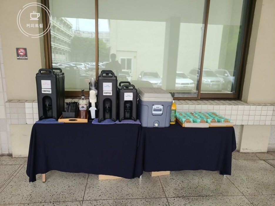 준비한 메뉴는 아이스 아메리카노 커피 1통+1/2통(1통에 약 75잔 정도나옴), 핫아메리카노 1통 그리고 쿠키를 준비하여 서비스 하여드렸습니다. 아이스아메리카노를 드실때 얼음을 드실수 있도록 아이스박스에 얼음을 준비를 하여 시원하게 드실수 있도록 셋팅을 하였습니다.