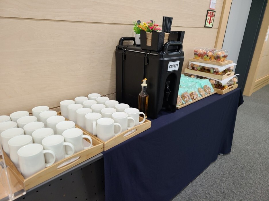 머그컵, 쿠키, 페스츄리, 컵과일을 같이 셋팅을 하였습니다.