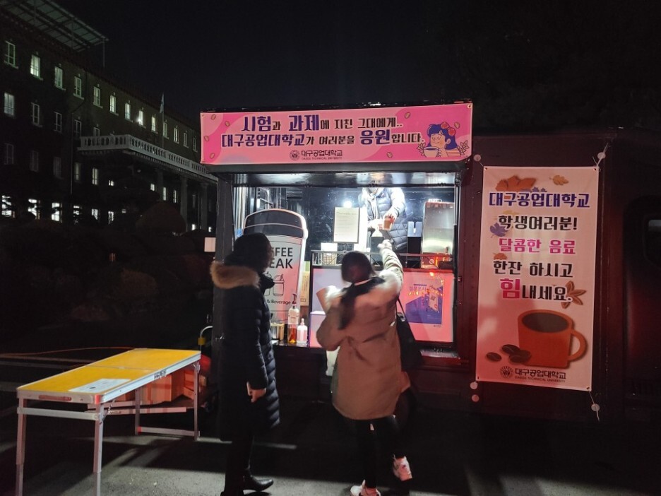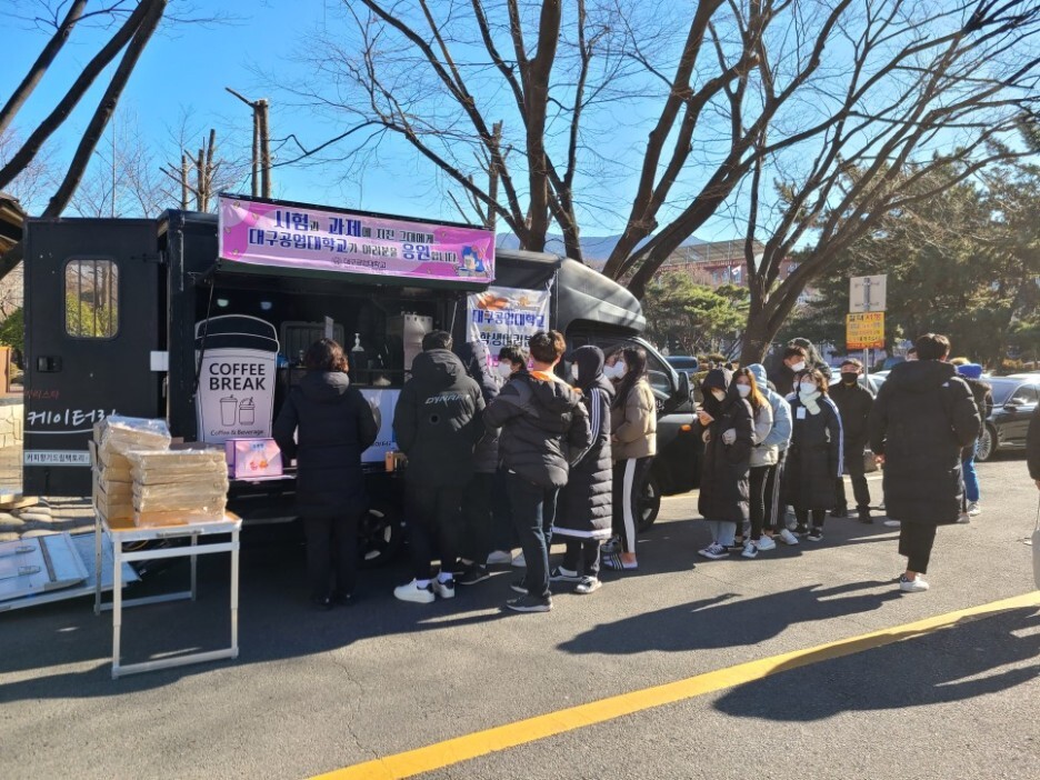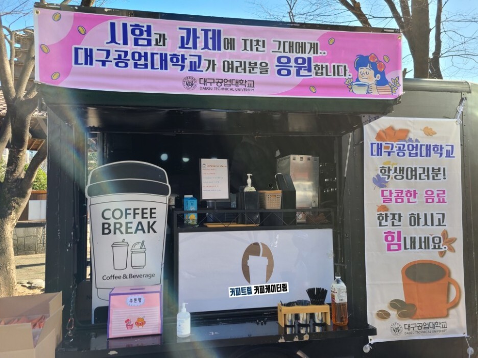 2020년 12월15일 대구공업대학 에서 진행한 커피케이터링후기입니다. 이번 행사는 실내가 아니라 실외에서 하는 행사로 대구공업대학 학사 운영처에서 주최하여 진행을 하였으며, 시험과 코로나19로 지친 학생과 학교 관계자 분들을 위해 포드트럭으로 진행을 한 행사 입니다.