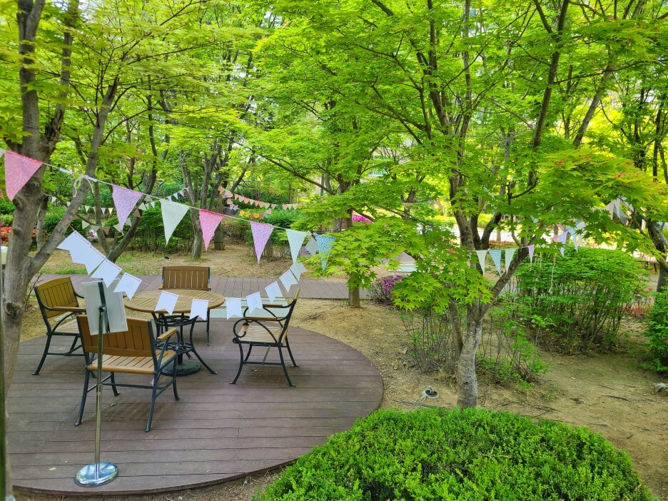 어린이집에서 준비한 가랜드로 아파트 주변 공원에 장식을 하니