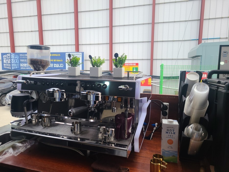 커피차는 안전하게 자리를 잡고 전기가 지원이 되는 곳이라 많은 어려움 없이 셋팅을 완료하자 현장근로자분들의 줄이 이어졌고 그렇게 정해진 잔수를 빠르게 채우며 행사를 진행하였습니다.