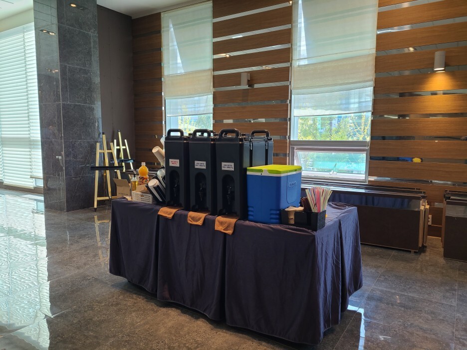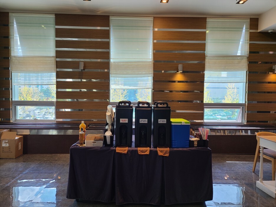 커피 트립에서 준비한 메뉴는 아메리카노 단일 메뉴로 따뜻한 커피와 시원한 커피 이렇게 두 가지를 준비를 하여 직접 따라 마실 수 있도록 하였으며, 커피를 드시지 못하시는 분들을 위해 음료도 같이 준비를 하였습니다.
