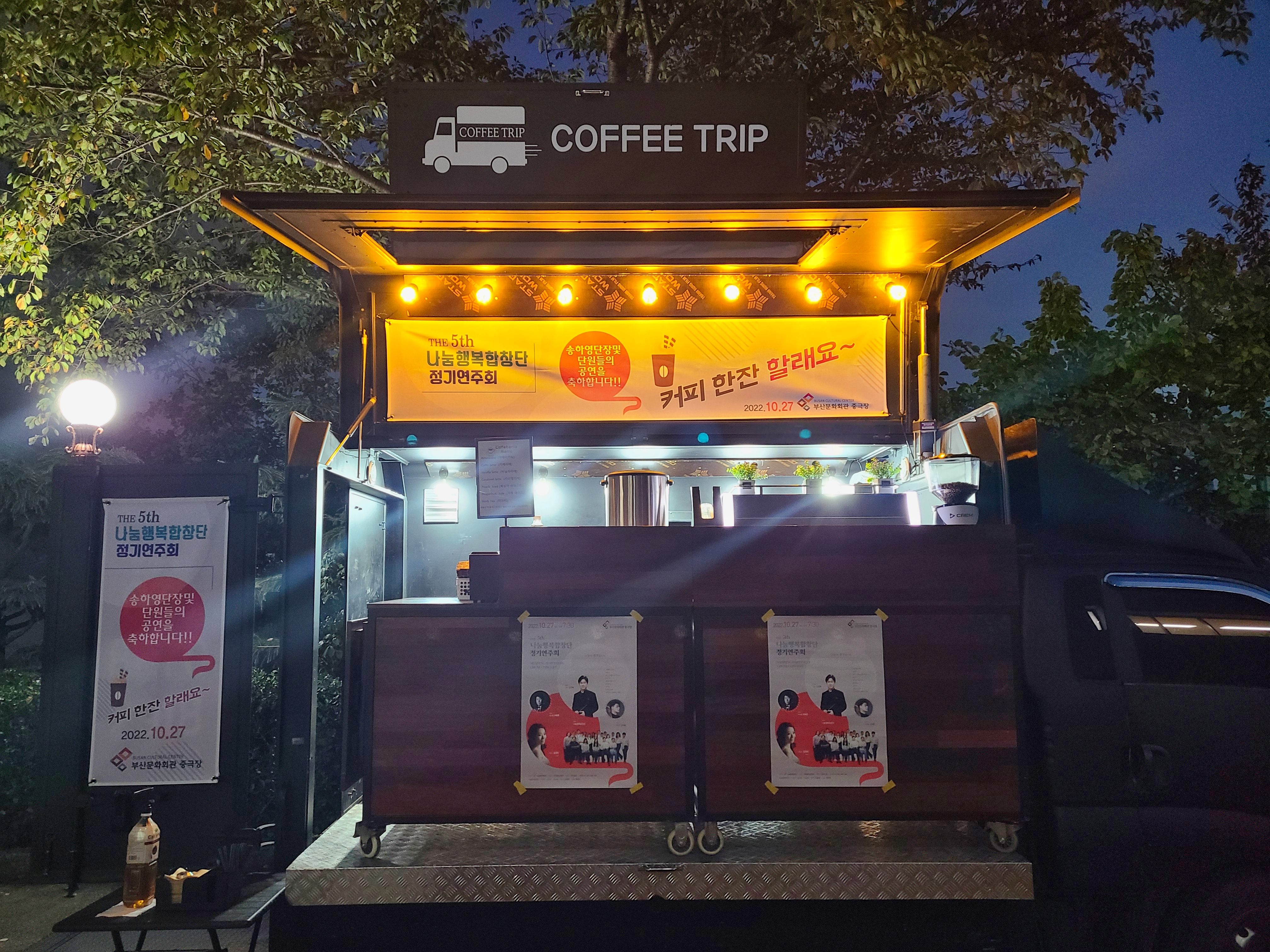 2022년 10월 27일 부산 문화회관 중극장에서 진행한 제5회 나눔 행복 합창단 정기 연주회 공연에 커피차를 운영하였습니다.