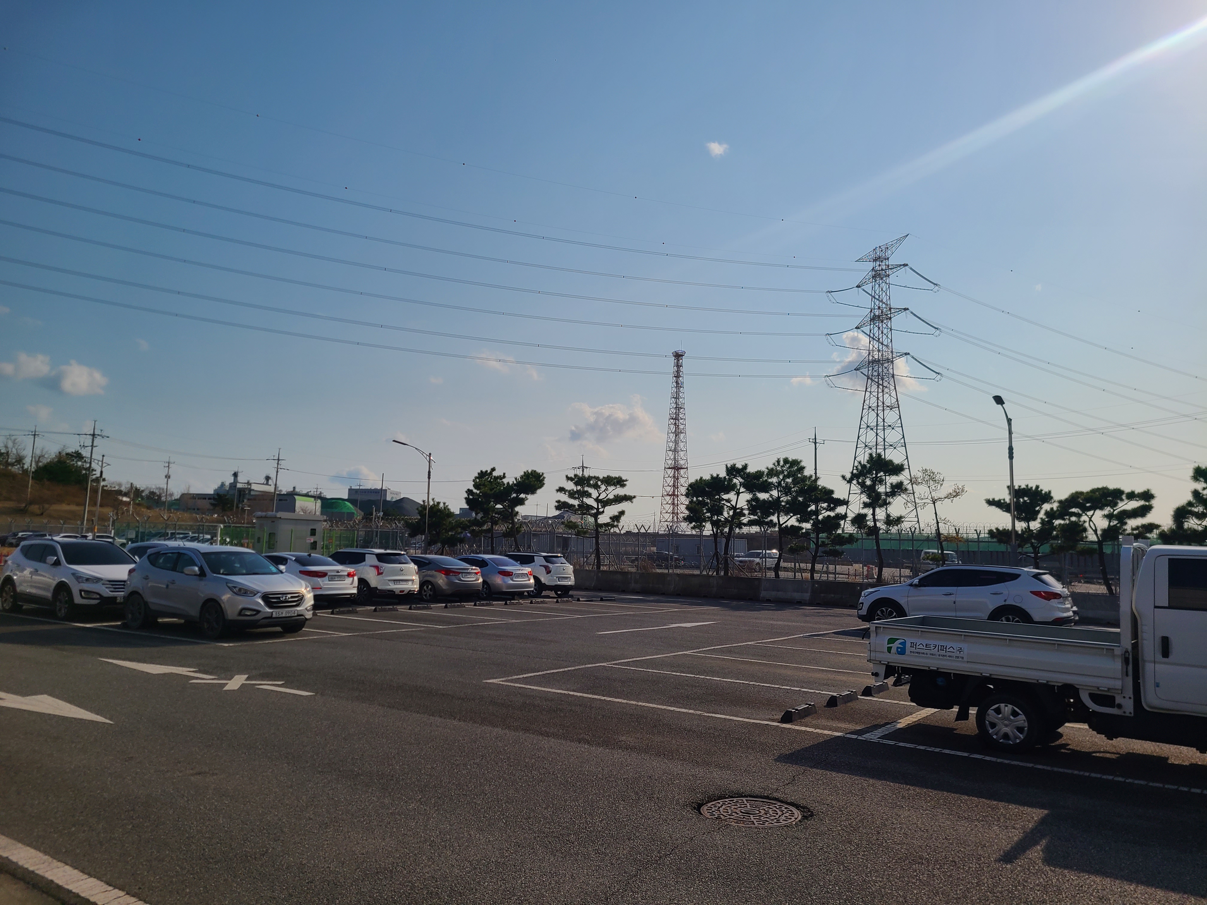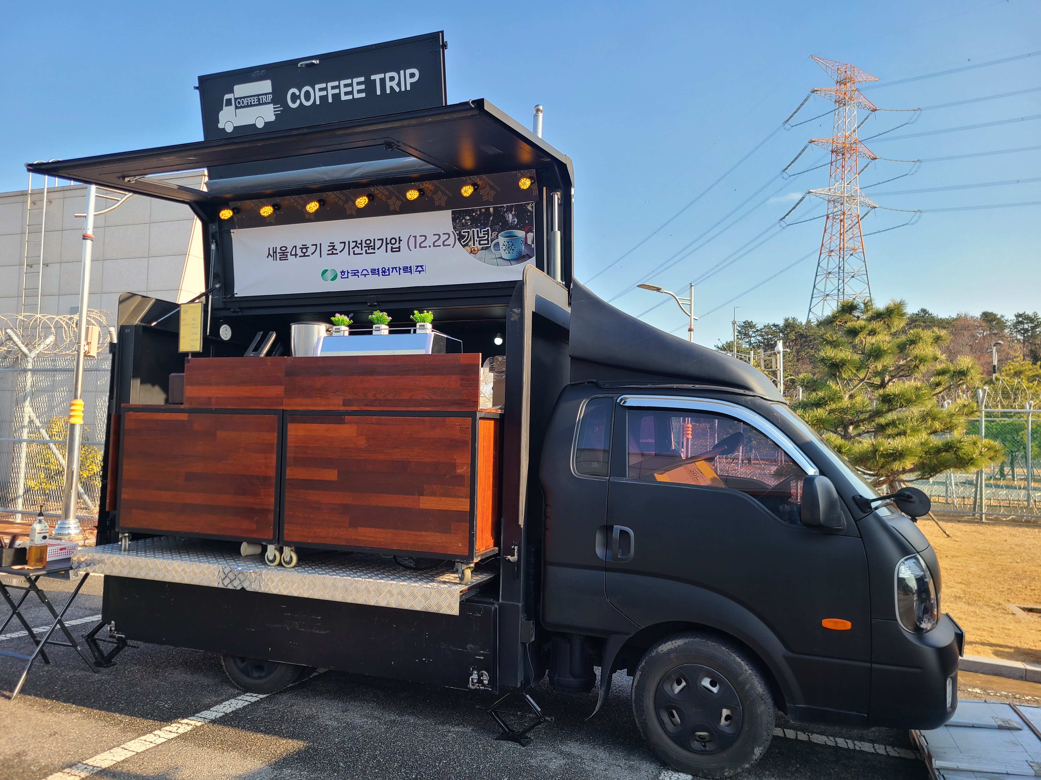 주변을 보면 온통 전선과 철탑들이 빼곡하게 둘러싸여 있는 이곳에 커피 트립 커피차가 12월의 매서운 바람을 뚫고 직원식당 앞에 세팅을 하였습니다.