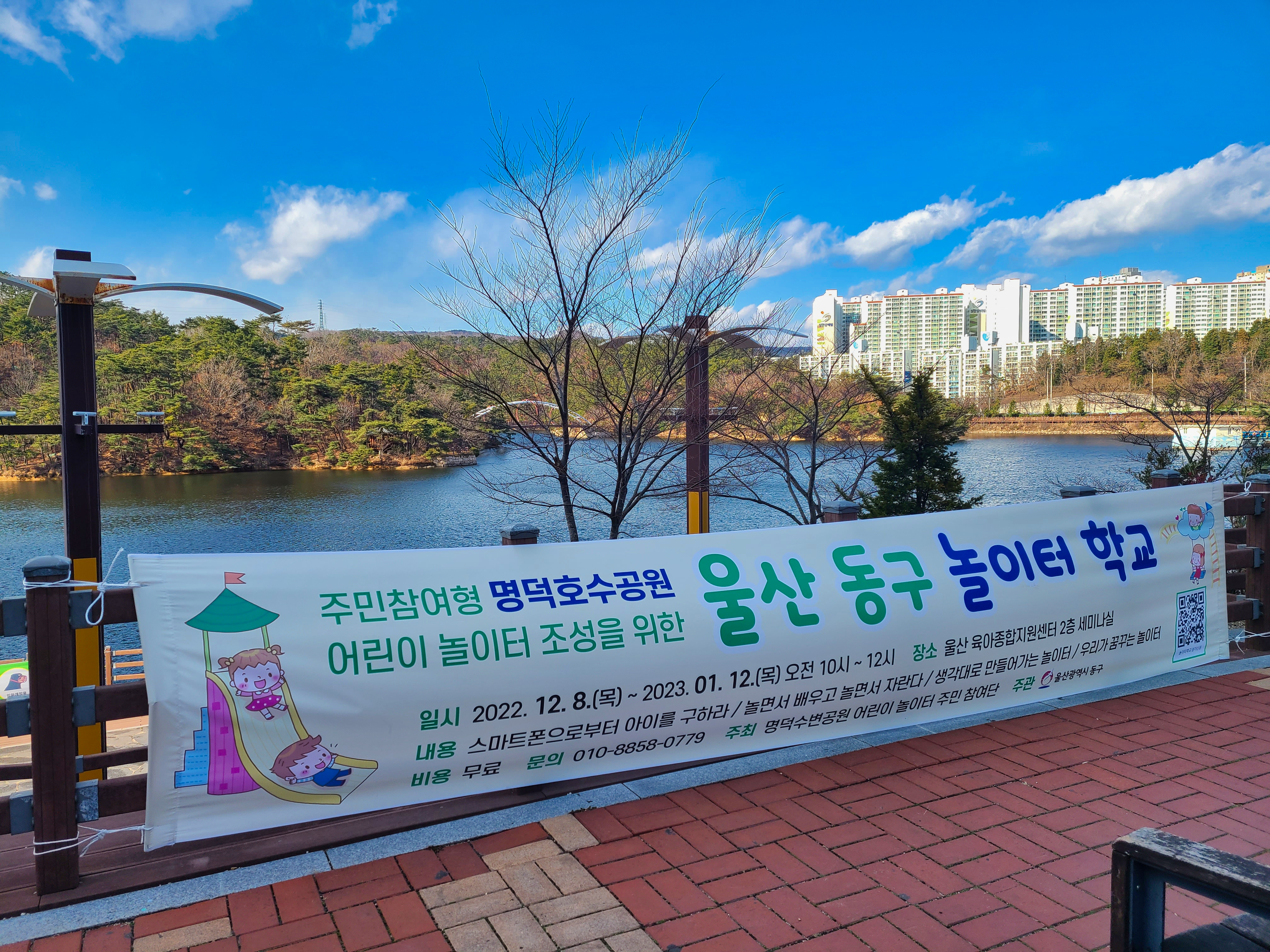행사를 진행하는 명덕호수는 울산 동구에 위치한 도심 친화적인 호수 공원입니다. 큰 규모라서 날씨가 좋은 날엔 많은 사람들이 공원 산책과 운동을 하는 사람들이 많은 곳으로 맑은 물과 자연이 있어 걷기 좋은 곳입니다.