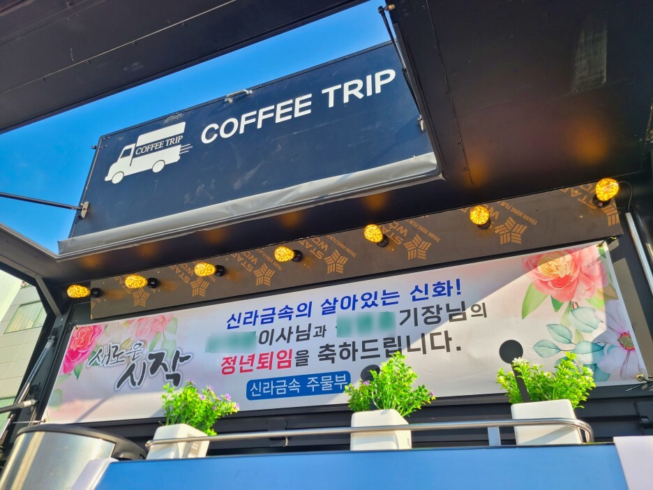 이번 커피차는 오** 이사님, 김**기장님의 정년퇴임을 기념하기 위해 신화금속 주조부에서 커피차를 섭외한 행사였습니다. 예전에는 연예인과 유명인들이 이용하던 커피차가 대중적으로 다가가는 것 같습니다.