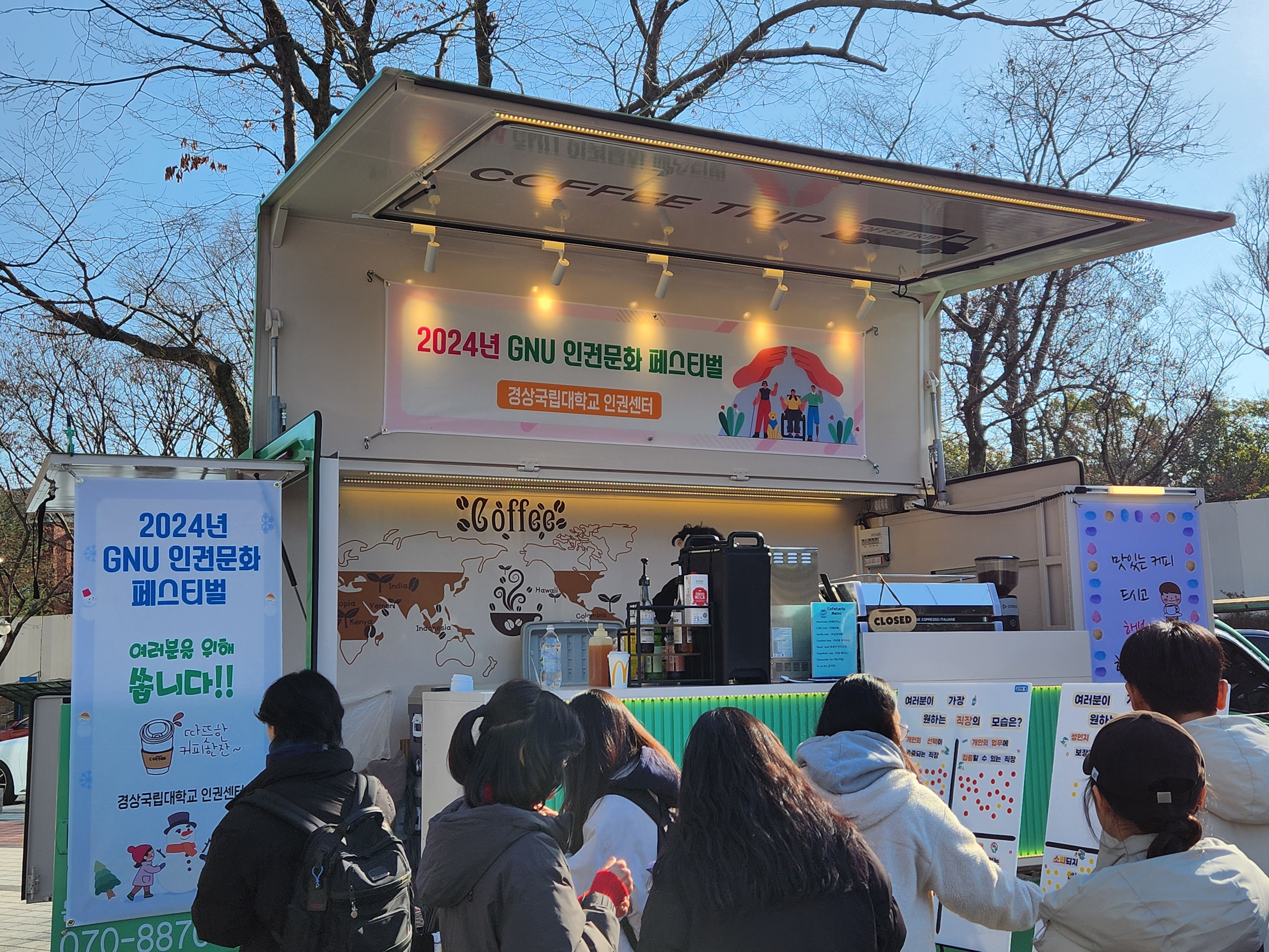 2024년 12월 10일, 경상대학교에서 열린 GNU 인권문화 페스티벌에서 커피트립 출장커피가 특별한 커피차를 운영했습니다. 이번 행사는 교제폭력 및 스토킹 범죄 예방을 위한 설문조사를 진행하며, 인권 인식을 높이는 뜻깊은 자리였습니다.