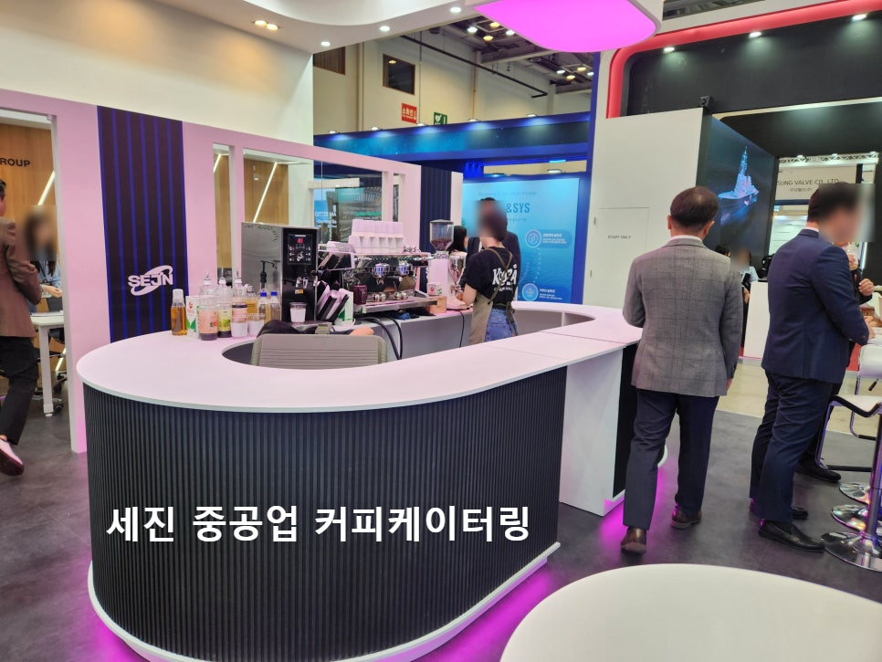 세진중공업은 초대형 조선 기자재를 전문적으로 생산하는 글로벌 기업으로, 고난도 기술력과 대규모 생산 인프라를 바탕으로 세계 시장에서도 높은 신뢰를 받고 있습니다. 부스 규모가 큰 만큼 행사 기간 내내 방문객의 발길이 끊이지 않았고, 커피트립은 빠른 동선 운영과 안정적인 음료 제공으로 원활한 상담 환경을 지원했습니다.