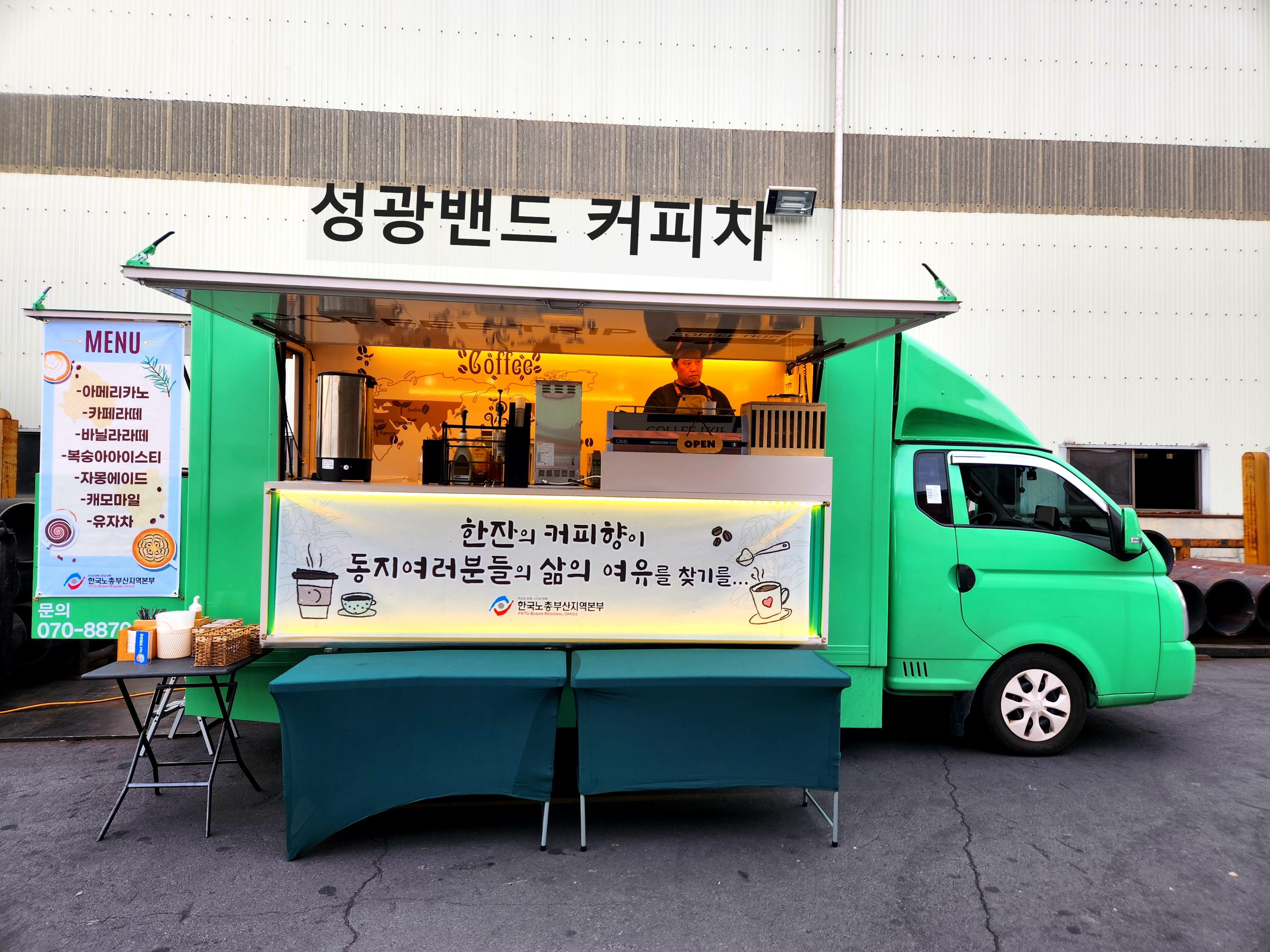 커피 한 잔은 짧은 휴식일 수 있지만, 그 안에는 응원과 위로의 마음이 담겨 있습니다. 이번 성광밴드 커피차 현장은 그 의미를 다시 한번 확인할 수 있었던 소중한 시간이었습니다. 한국노총 부산지역본부의 따뜻한 마음과 커피트립의 정성이 만나 만들어낸 작은 힐링의 순간들이 오래 기억되길 바랍니다.