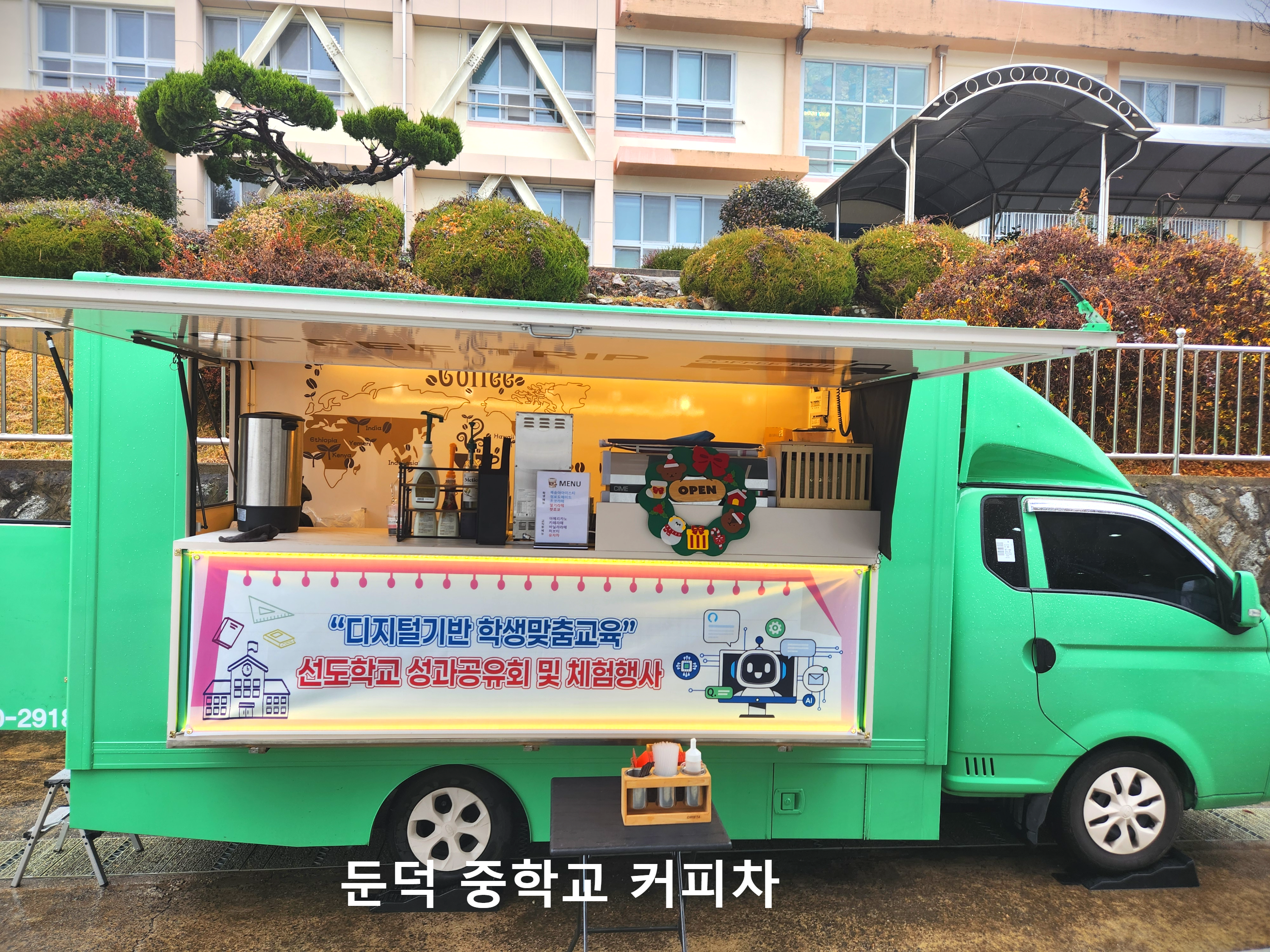 2025년 12월 24일, 거제 둔덕중학교에서 열린 덕인일심제 현장에 커피트립이 커피차로 함께했습니다. 푸른 바다가 학교를 포근히 감싸 안은 둔덕중학교는 교문을 나서면 탁 트인 거제 바다가 한눈에 들어오는 아름다운 곳으로, 그 풍경만으로도 설렘이 느껴지는 특별한 공간이었습니다.